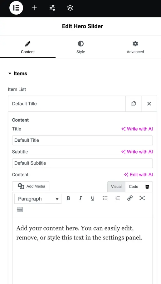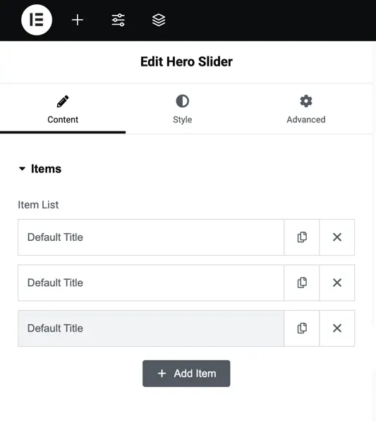 • Item List – Add multiple slides with unique content. Each item can include a title, subtitle, description, image/video, and buttons.