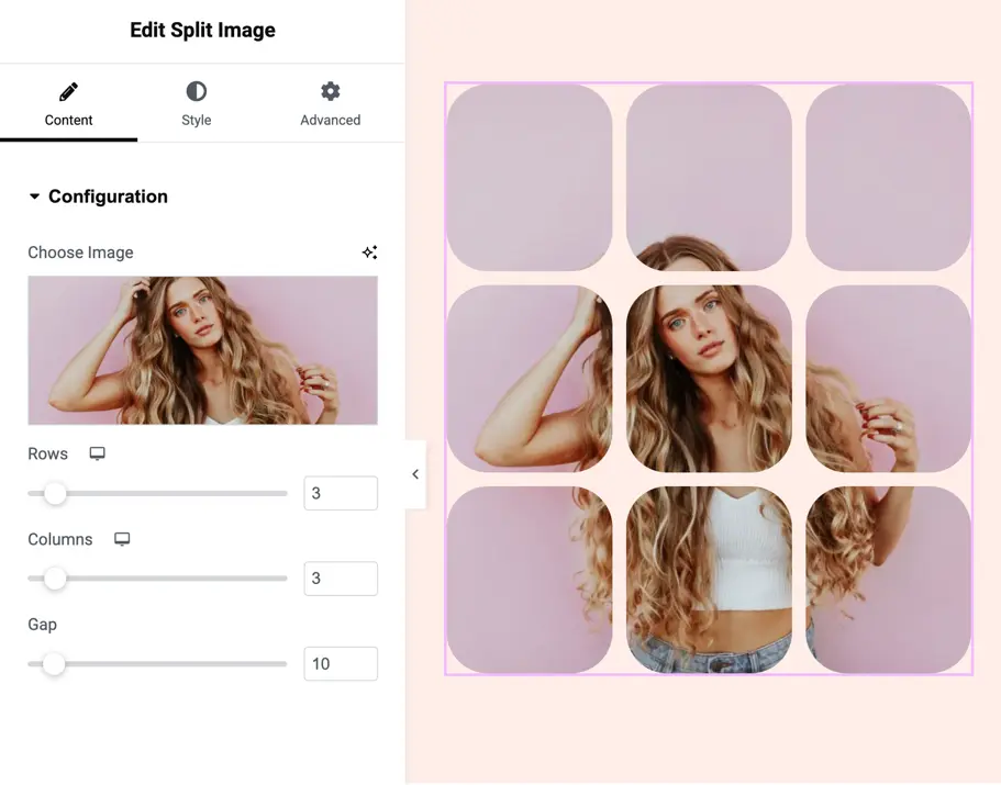 The Split Image widget allows you to divide an image into multiple interactive segments, creating a unique and engaging visual effect. You can customize the number of rows and columns, adjust spacing, and style each split portion effortlessly. This widget is completely free and ideal for creative layouts, galleries, and hover-based designs.