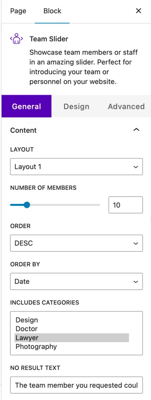 Here, you can select the categories of team members you want to display in the slider.