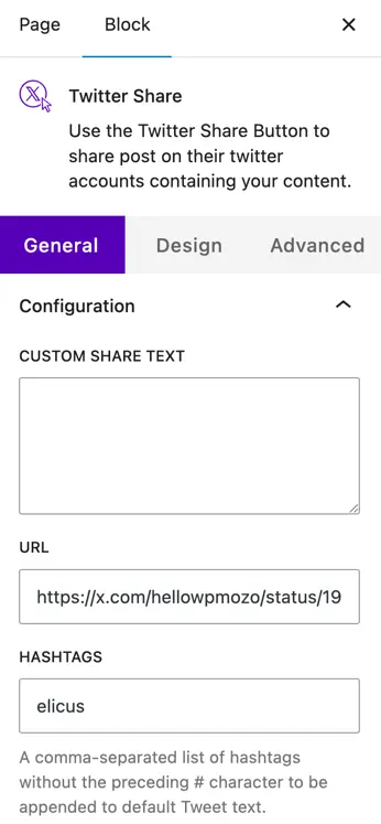 The Twitter Share Block lets you easily add a Twitter Share button to your website. Visitors can share your posts or pages on their Twitter accounts with customized text, hashtags, and mentions, helping increase your social reach.