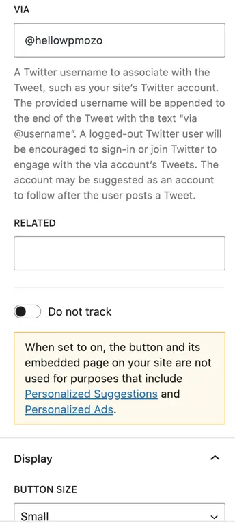 Optionally, add related Twitter accounts to suggest after sharing. - Do Not Track: